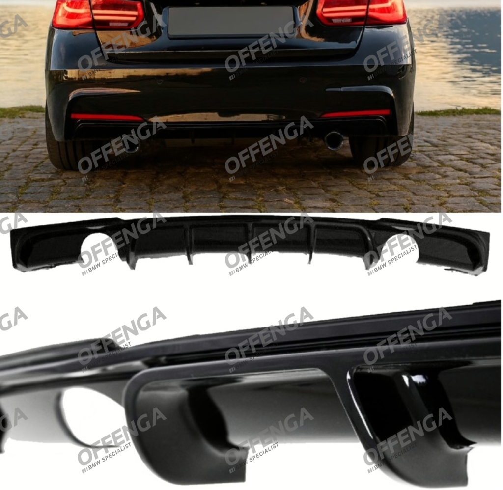 Achterdiffuser in het hoogglans zwart, toepasbaar op 3 serie F30/F31 modellen met M-bumper. Alleen voor modellen met dubbele uitlaat links en rechts. Met een kleine aanpassing is deze ook toepasbaar op modellen met afneembare trekhaak, op modellen met inklapbare trekhaak past deze zonder aanpassing.