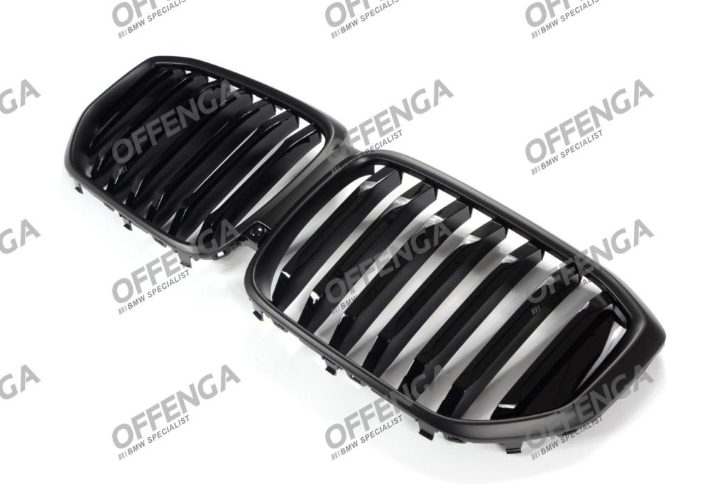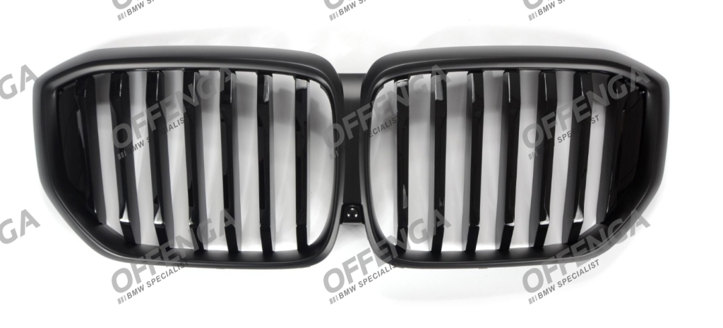 Grilledeelset met hoogglans zwarte enkele spijlen en matzwarte rand voor de X5 G05 facelift modellen vanaf 04/2023. Hoogwaardige kwaliteit en perfecte pasvorm.