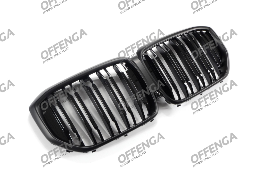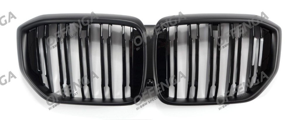 Grilledeelset met hoogglans zwarte dubbele spijlen en matzwarte rand voor de X5 G05 facelift modellen vanaf 04/2023. Hoogwaardige kwaliteit en perfecte pasvorm.
