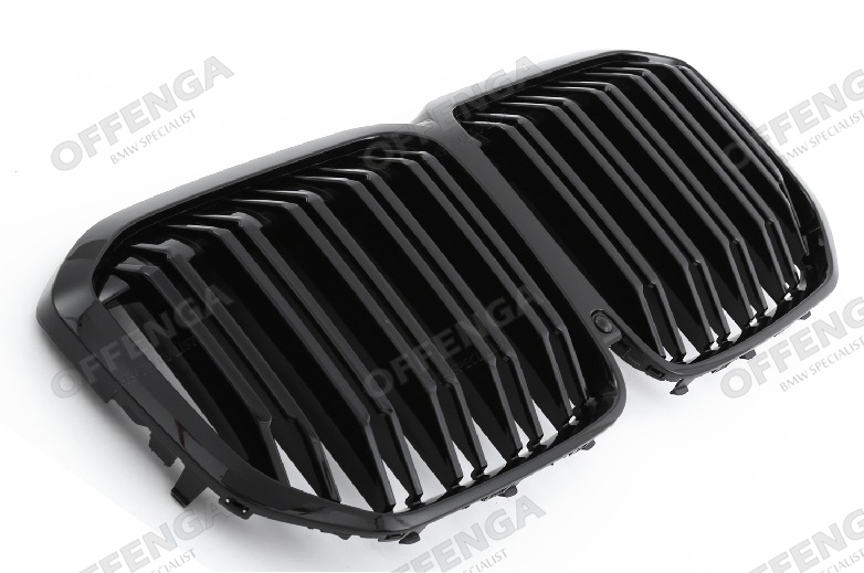 Grilledeelset met hoogglans zwarte dubbele spijlen voor de X7 G07. Hoogwaardige kwaliteit en perfecte pasvorm. Passend op modellen met Parking assistent camera.