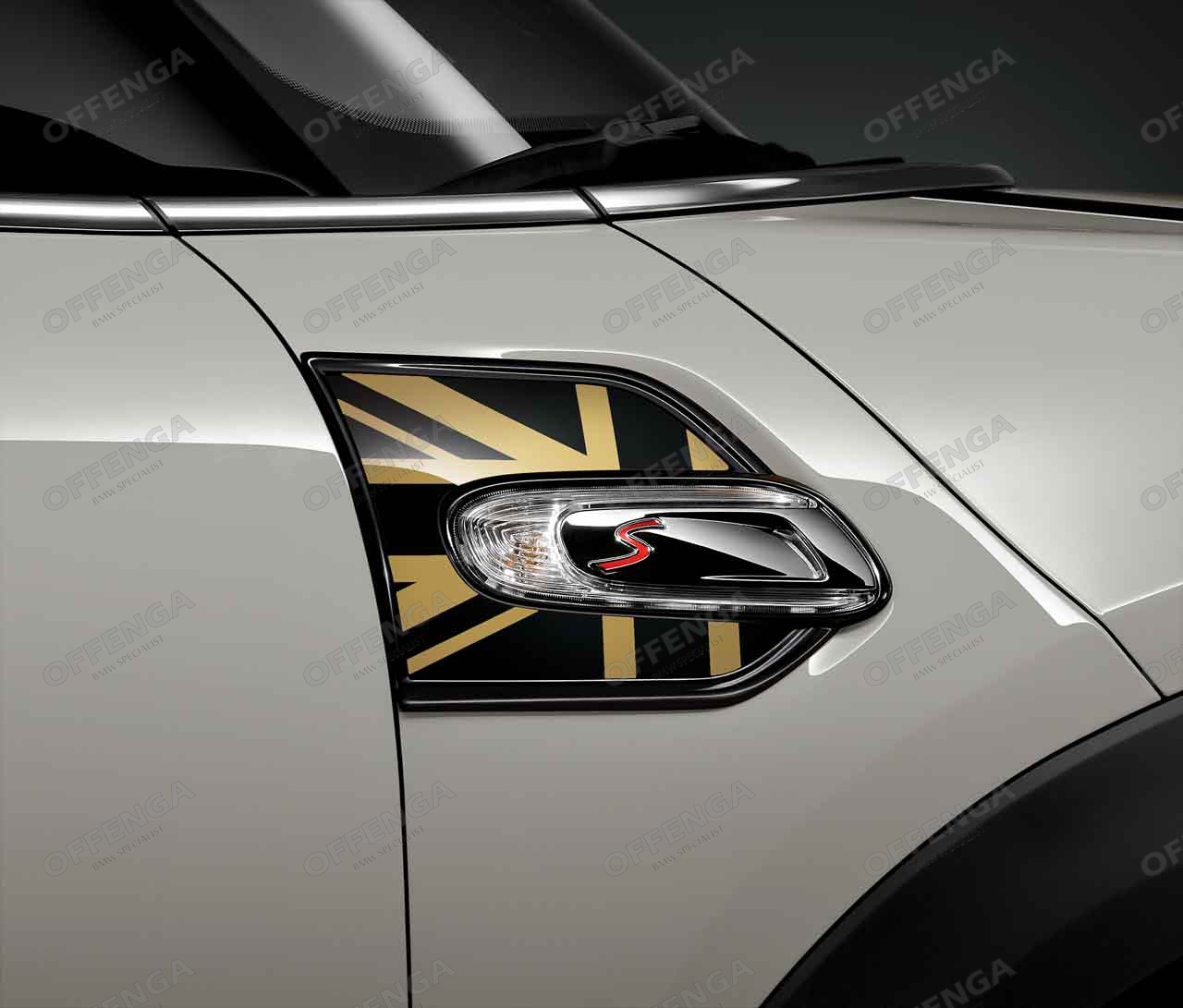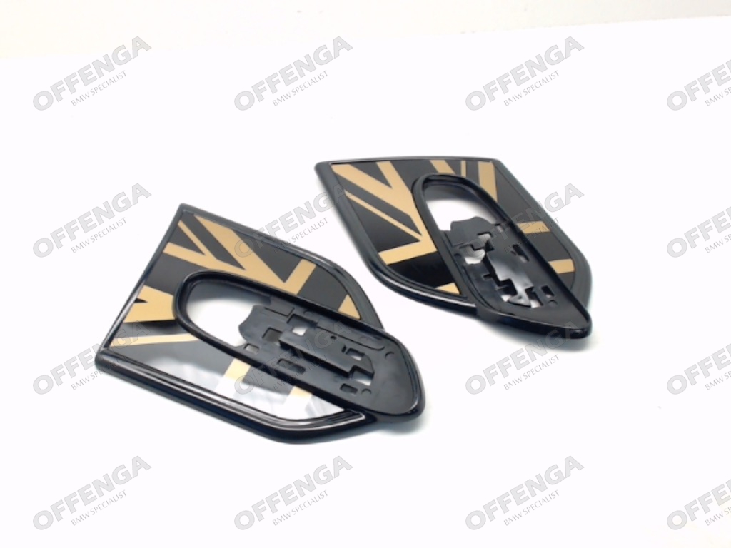 MINI Sier afdekkingen (side scuttles) voor de MINI F55 en F56. Dit zijn de afdekking welke bij het zijknipperlicht komen te zitten. De side scuttles zijn met een Union Jack met een gouden kleur uitgevoerd.