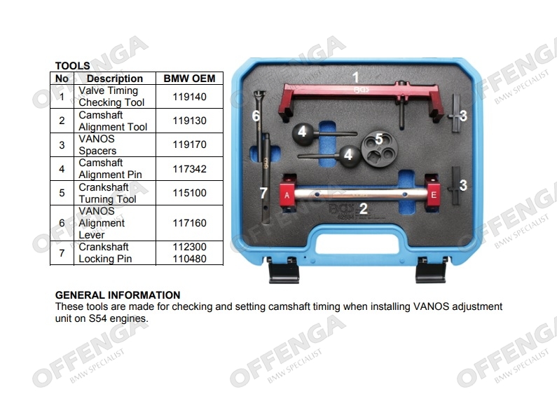 - Voor het controleren en instellen van de nokkenastiming bij het installeren van VANOS-   versteleenheid op S54-motoren